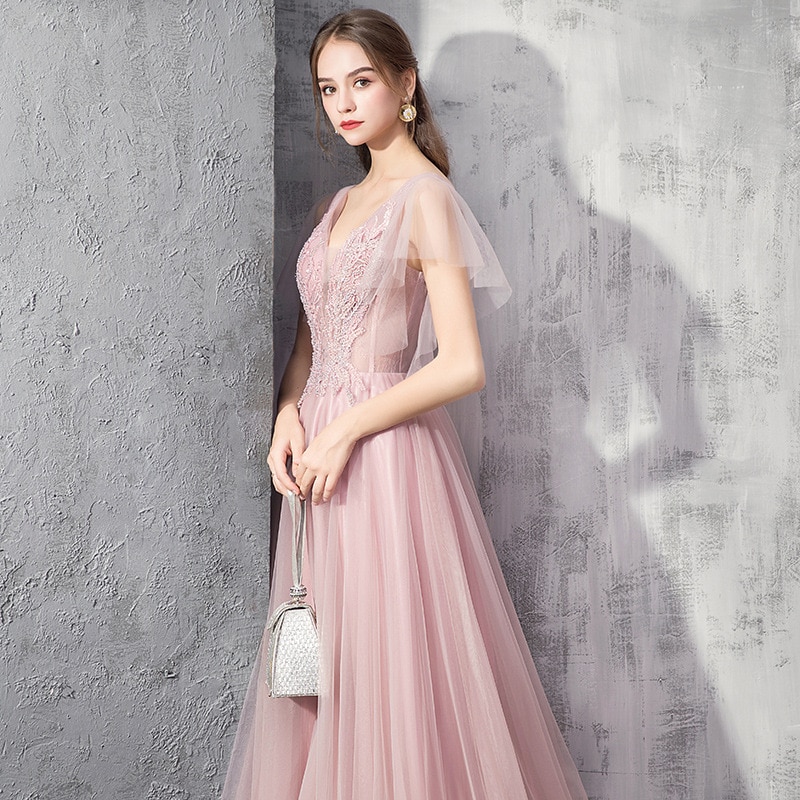 Découvrez la Robe Longue Demoiselle D’Honneur en rose, ornée de broderies uniques d’ailes pour une touche magique.