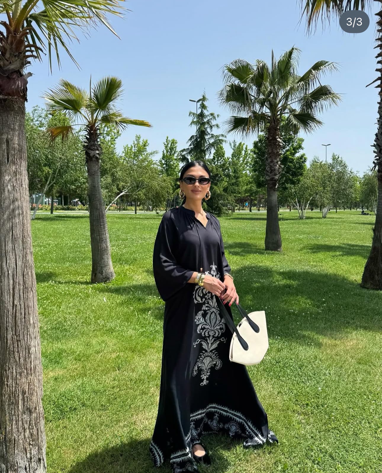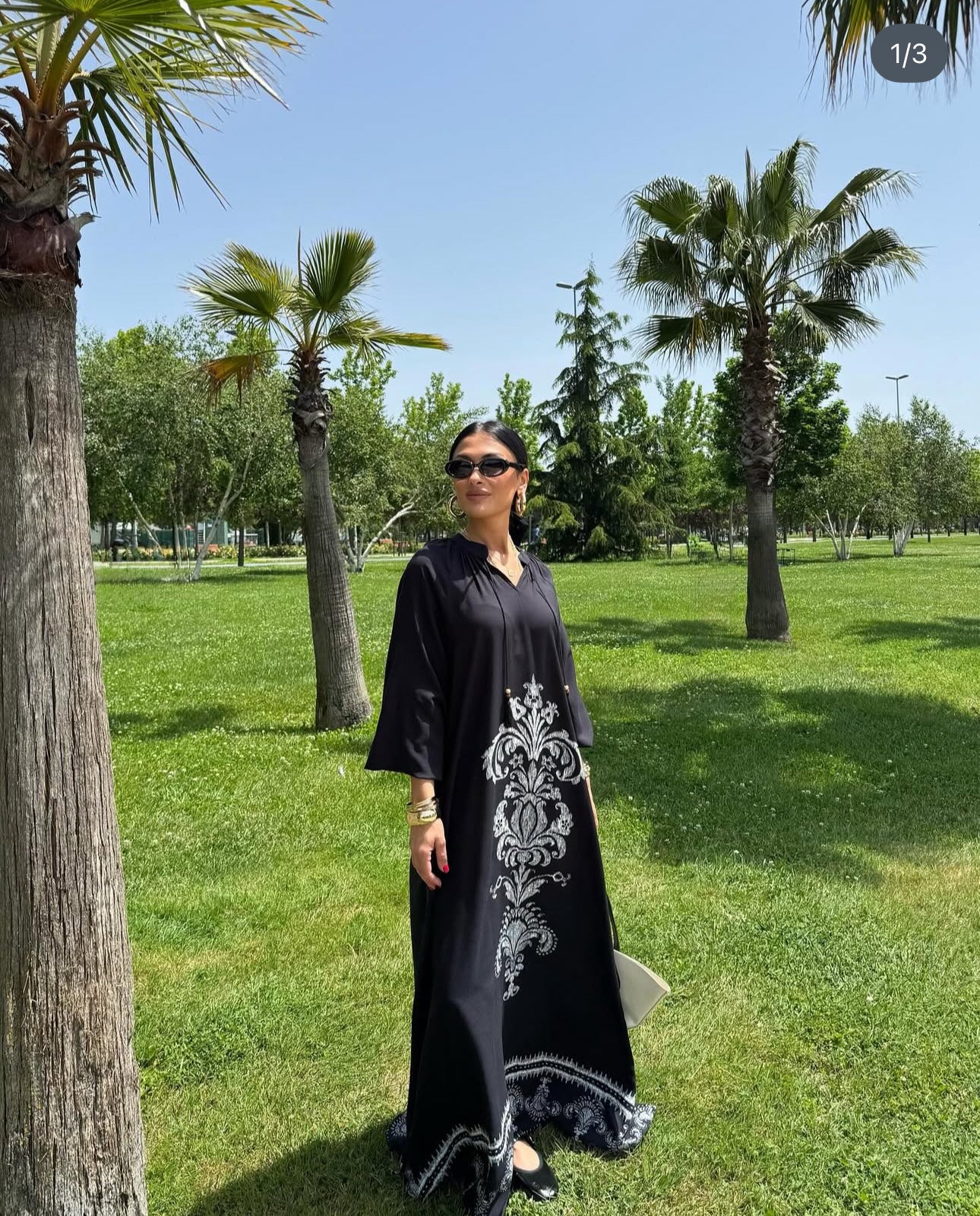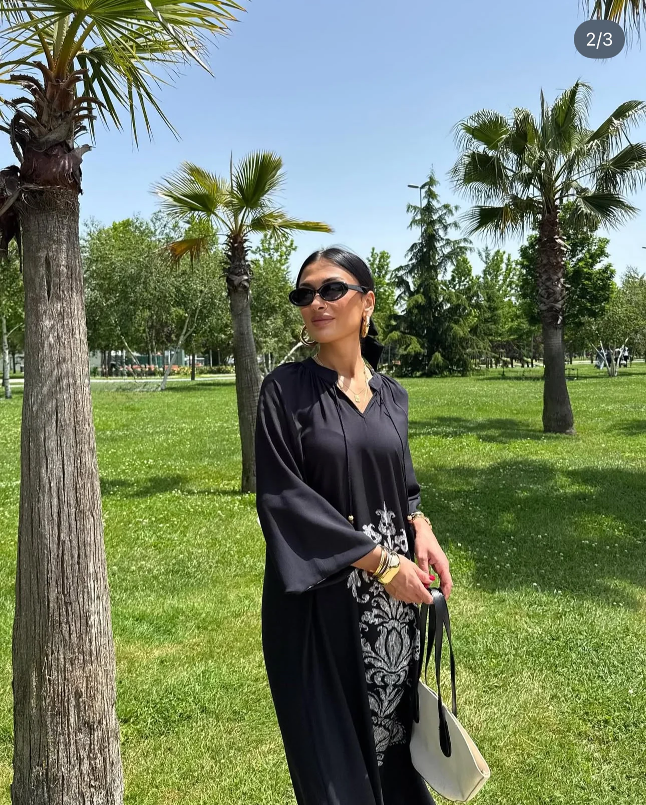 Chic et intemporelle, cette robe noire fluide se distingue par ses broderies blanches d’inspiration orientale. Parfaite pour vos journées estivales ou vos soirées habillées, elle allie confort et raffinement avec sa coupe ample et ses manches longues. Une pièce élégante pour un look sophistiqué sans effort.