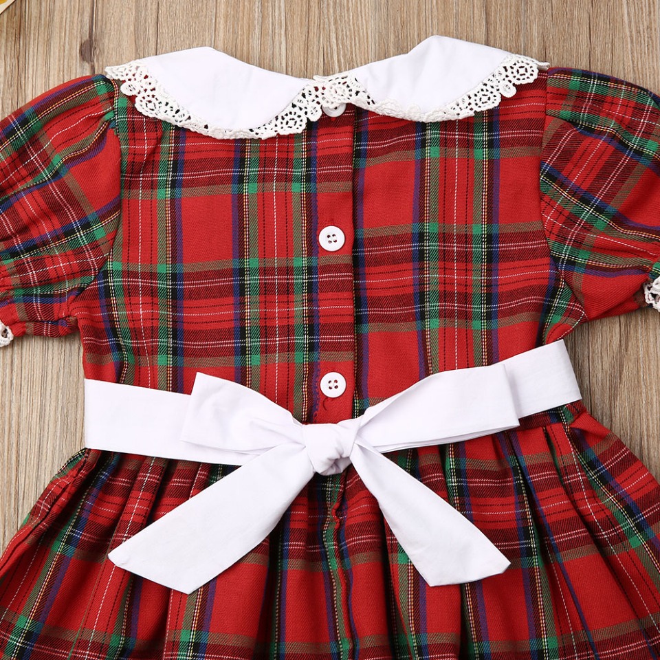 Parfaite pour le réveillon de Noël, cette robe de princesse rouge à carreau présente un col Claudine avec une ceinture en tissu blanc.