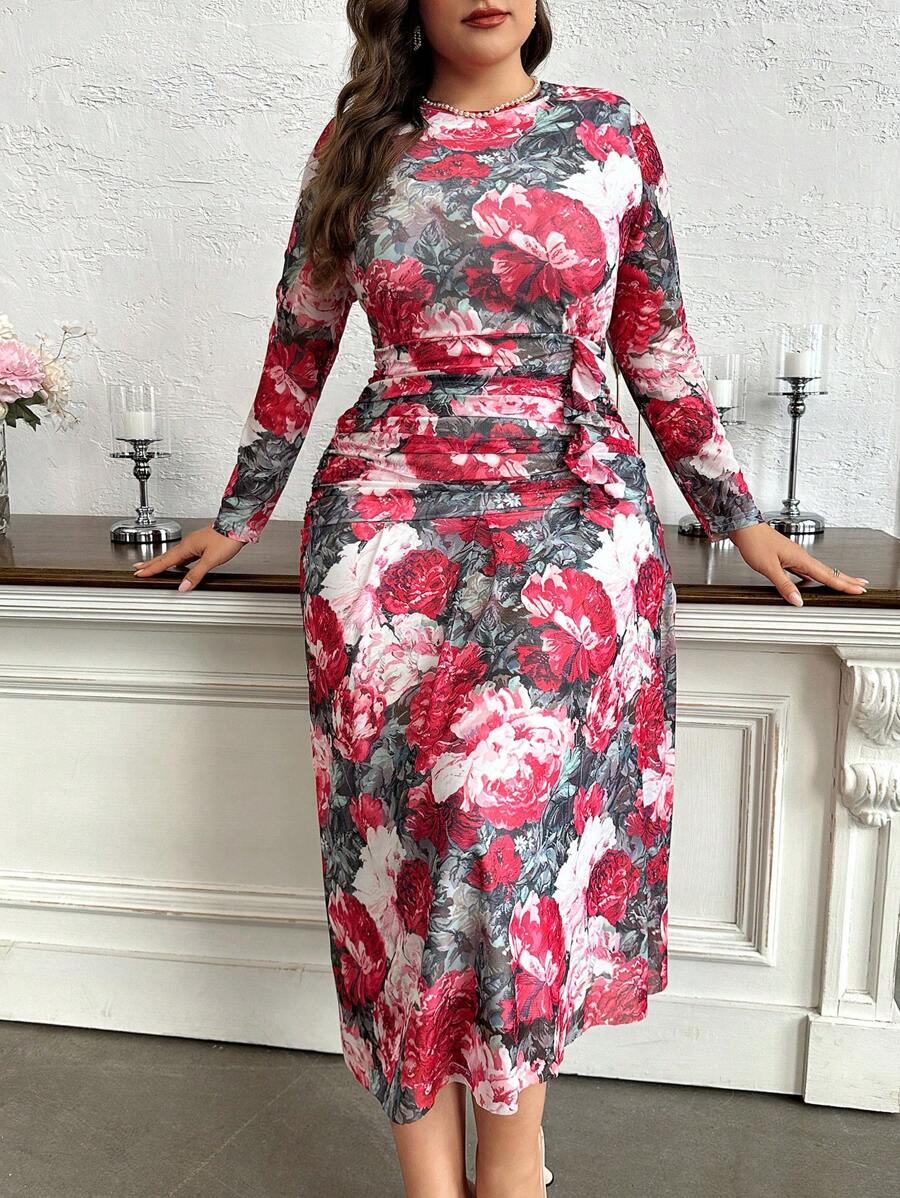SHEIN GRANDE TAILLE (44/46/48/50/52/54) – Robe fleurie à manches longues avec détail volanté sur le côté
