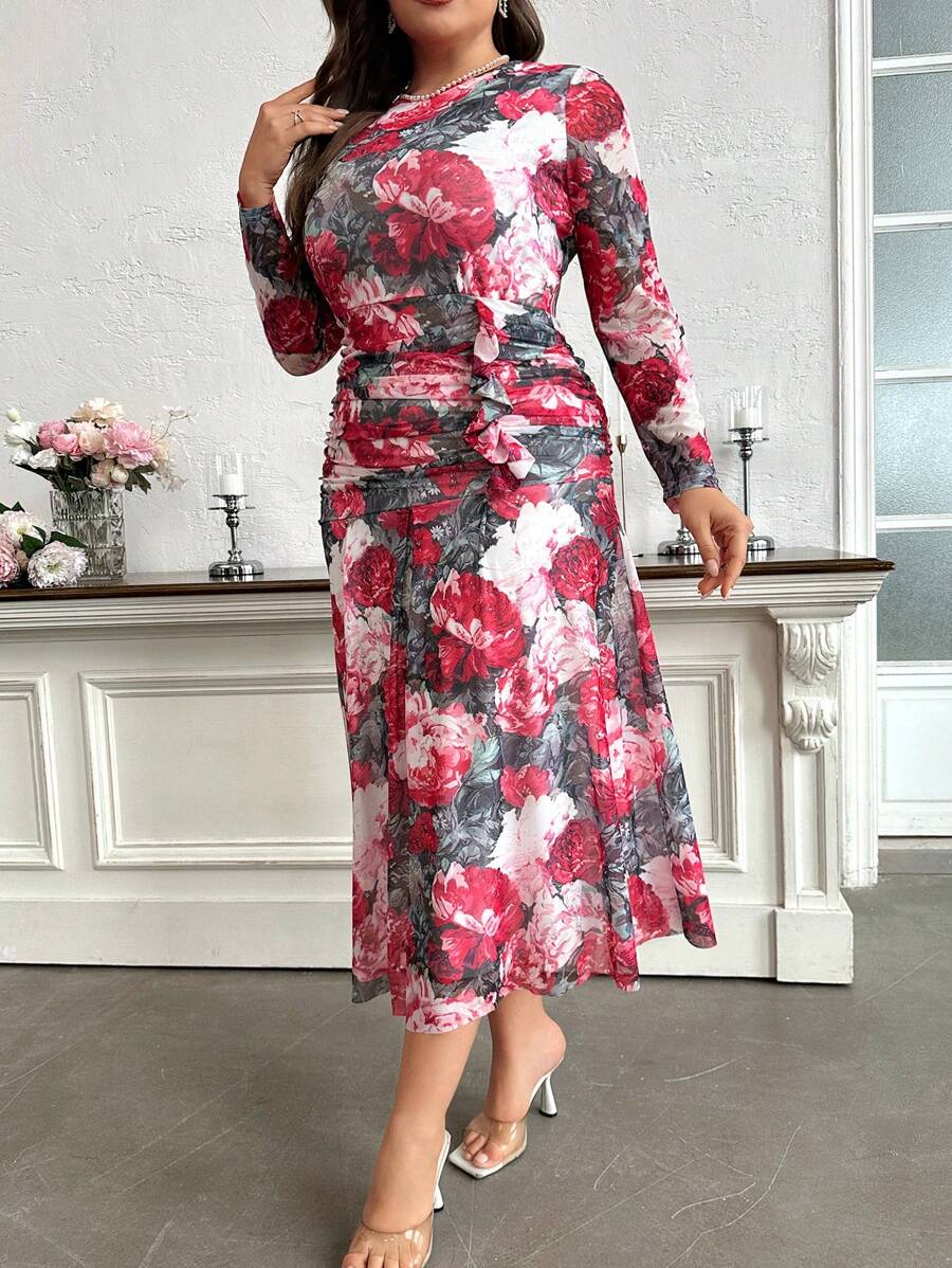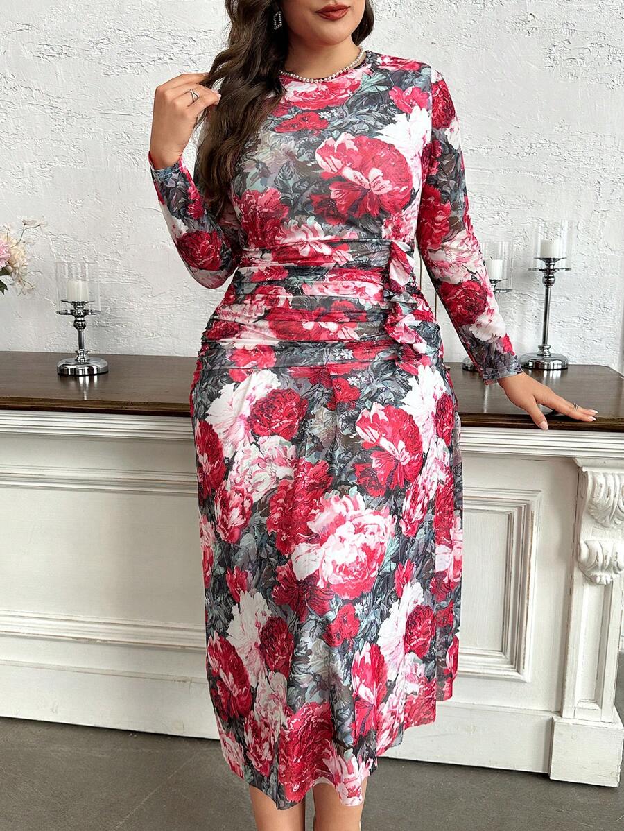 Robe fleurie grande taille avec manches longues et détail volanté sur le côté, idéale pour un look doux et féminin