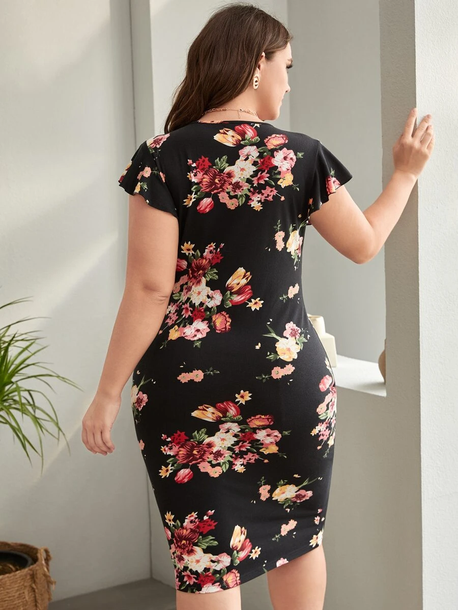Robe moulante fleurie avec col croisé et manches papillon, idéale pour un look chic et élégant