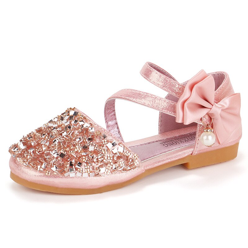 Vous aurez le choix entre les couleurs rose, argent et doré. Ces souliers fermés sont décorés par des strass sur le dessus et par un nœud ainsi que de perles sur les brides à scratch.