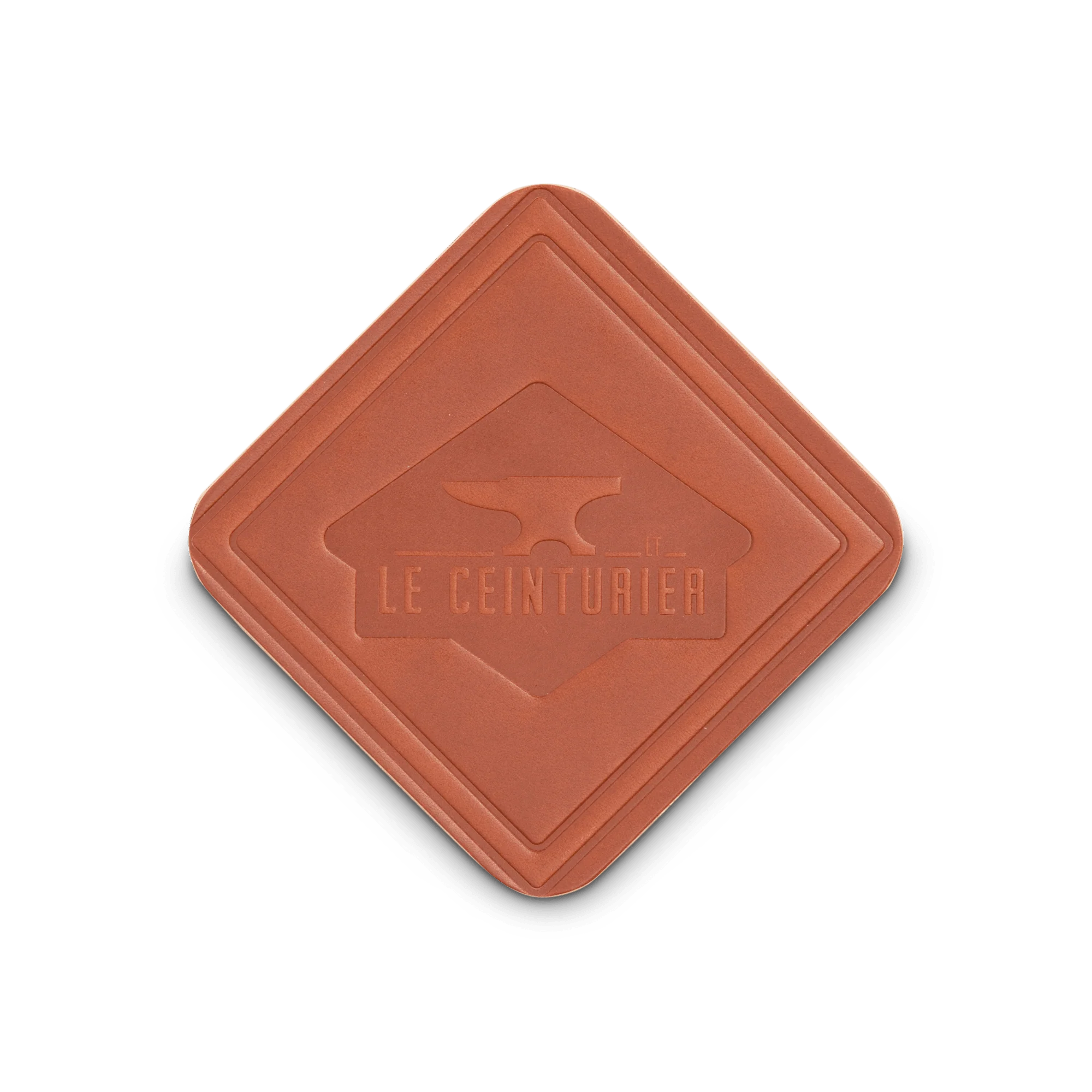 • Cuir origine France tanné en France • Tannage végétal sans sels de chrome • Cuir pleine fleur haut de gamme • Dessous de verre et son marquage réalisés en France dans l’atelier Le Ceinturier