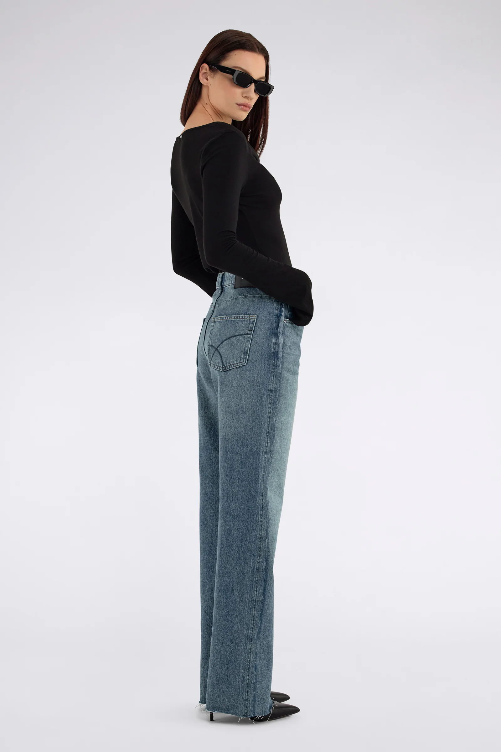 Jeans donna wide fit in denim indaco blu da 12.5 oz, dal look autentico e vissuto. Il lavaggio medio-chiaro con leggere abrasioni sui bordi dona un effetto naturally worn, mentre i fianchi a taglio vivo aggiungono un tocco raw e contemporaneo. Ideali per creare look casual con una forte personalità.