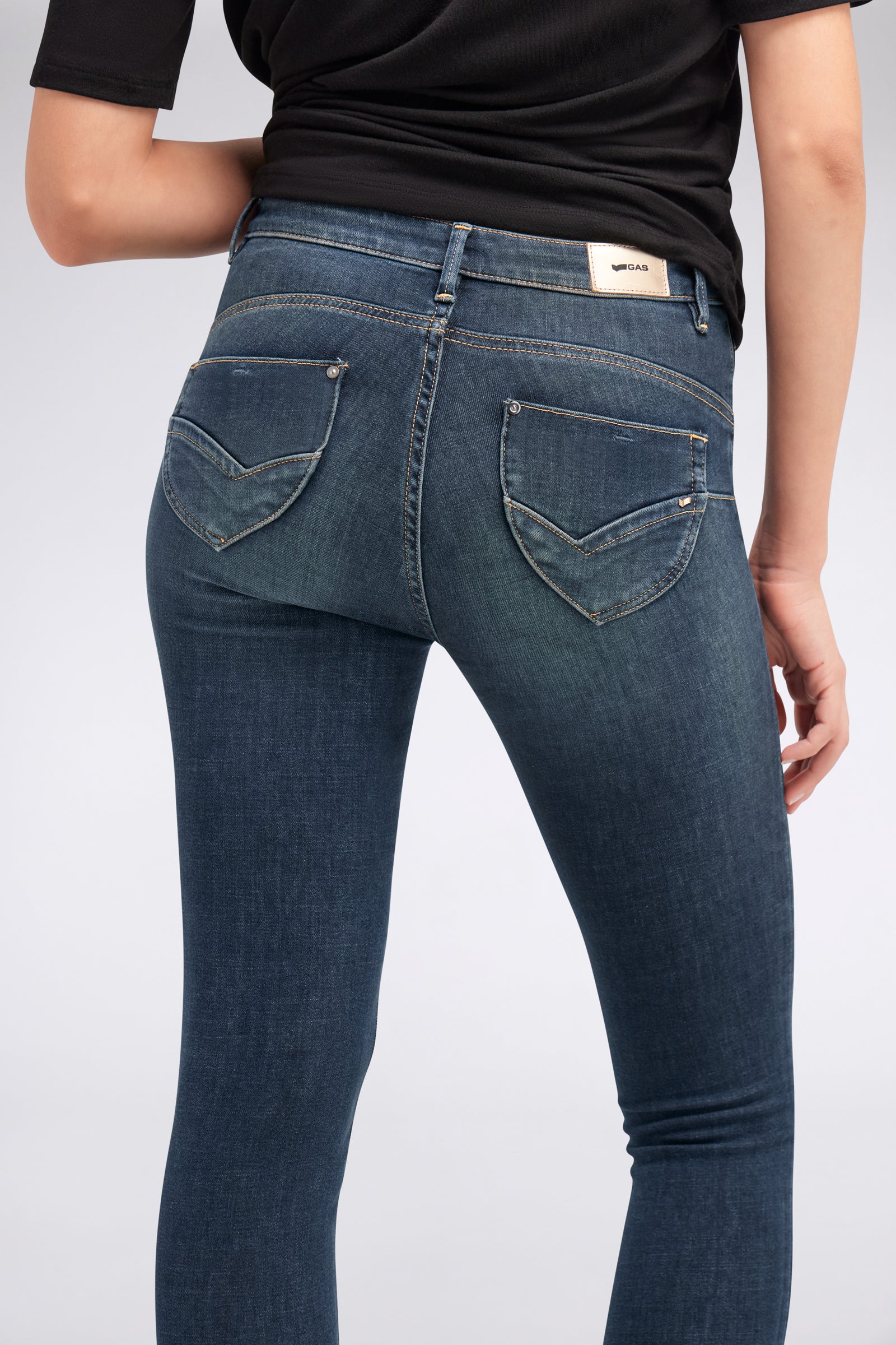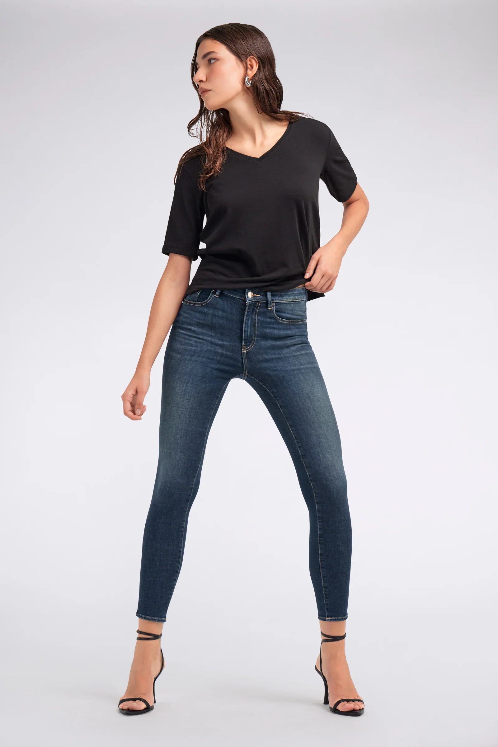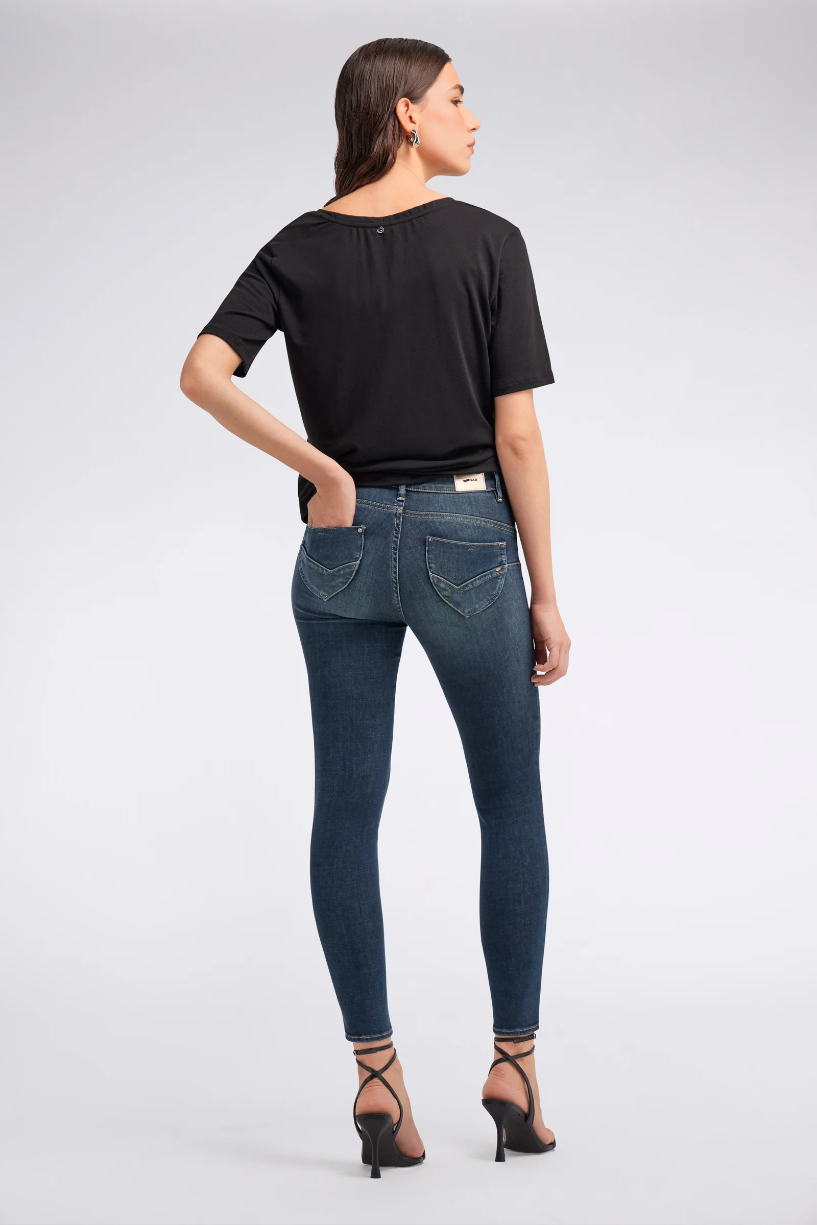 Denim 5 tasche skinny fit in tessuto premium performance stretch 10.80 OZ, lavaggio scuro essenziale con baffi 3D. Il design si aggiorna con nuove tasche posteriori dal taglio distintivo, per un look minimale ma deciso.