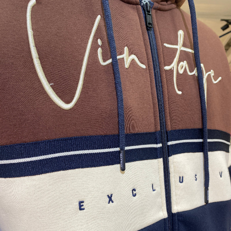 Adoptez un look décontracté et tendance avec ce sweat à capuche zippé de la marque Maxway. Son design color-block bleu marine, marron et blanc, rehaussé de l’inscription « Vintage Exclusive », vous assure un style affirmé en toute simplicité. Idéal pour vos sorties ou vos moments de détente, ce sweat confortable vous accompagnera au quotidien.