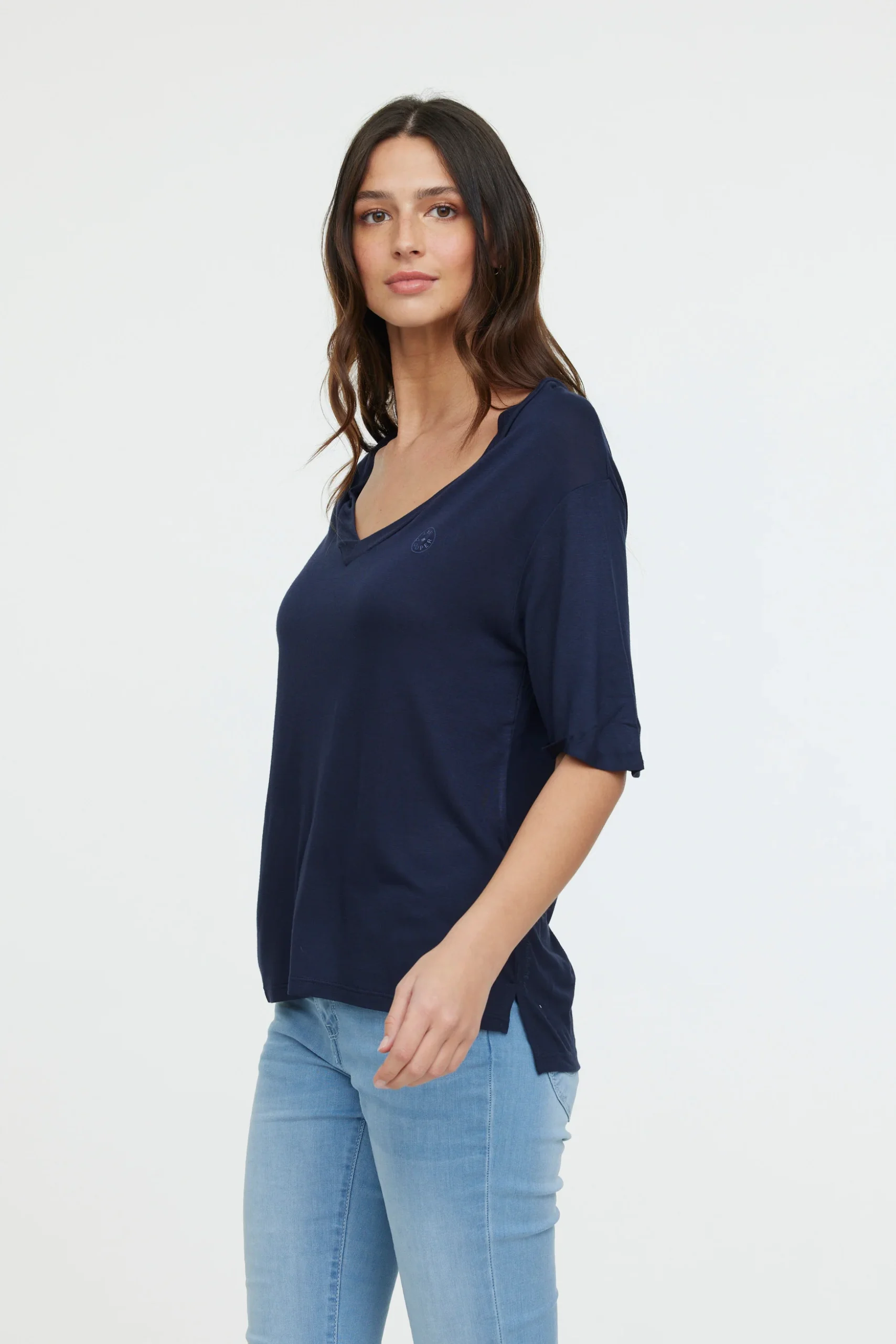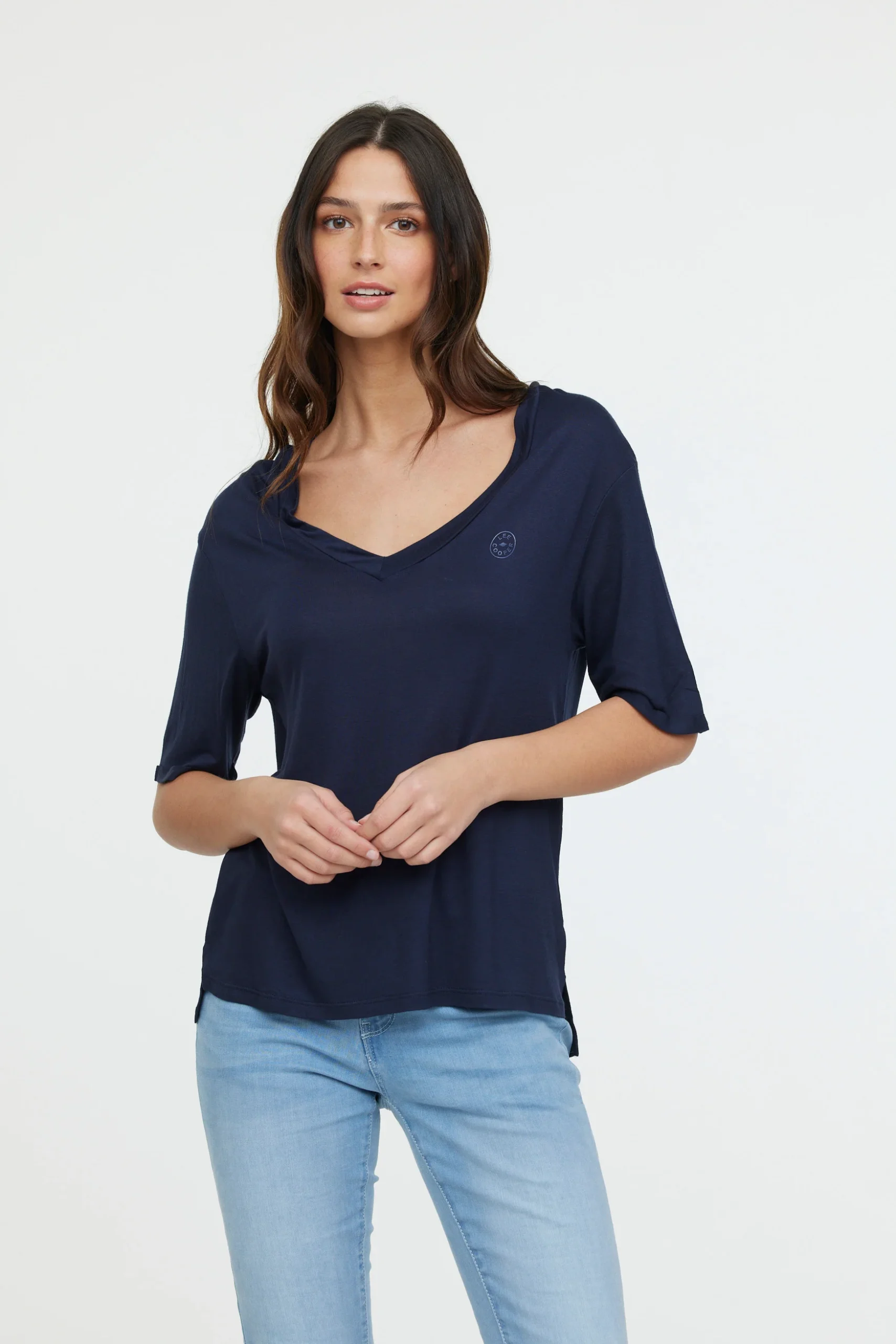 T-shirt basique manches courtes col V en viscose recyclée Le mannequin mesure 1.70 cm et porte la taille S