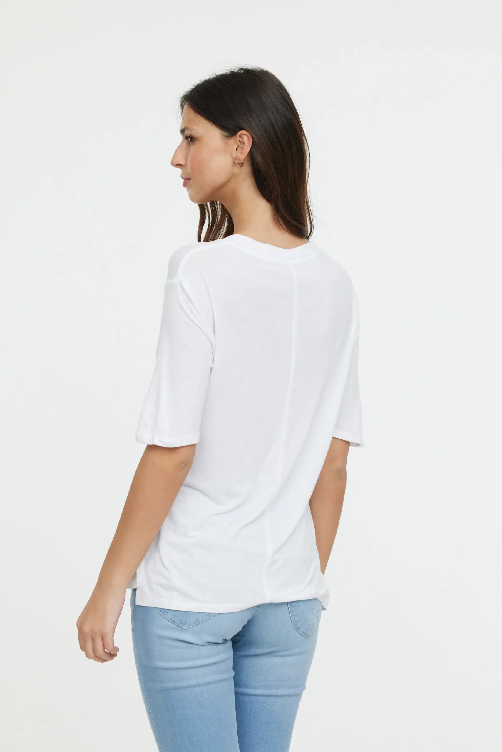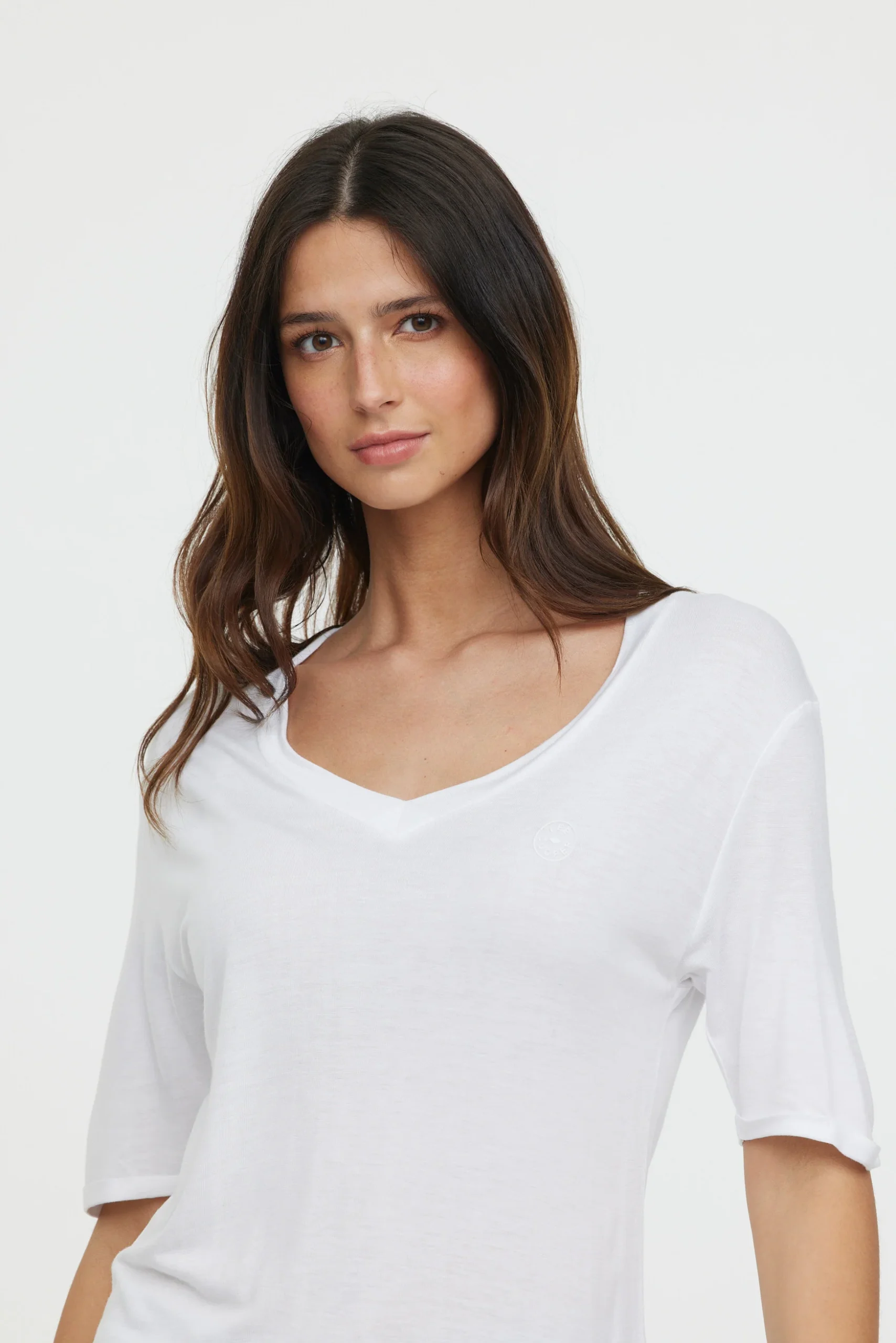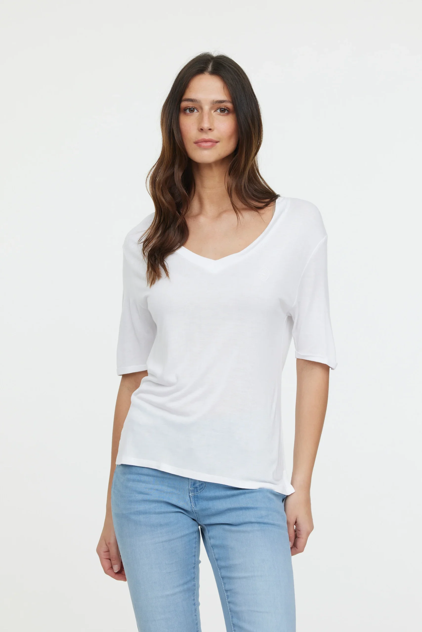 T-shirt basique manches courtes col V en viscose recyclée Le mannequin mesure 1.70 cm et porte la taille S