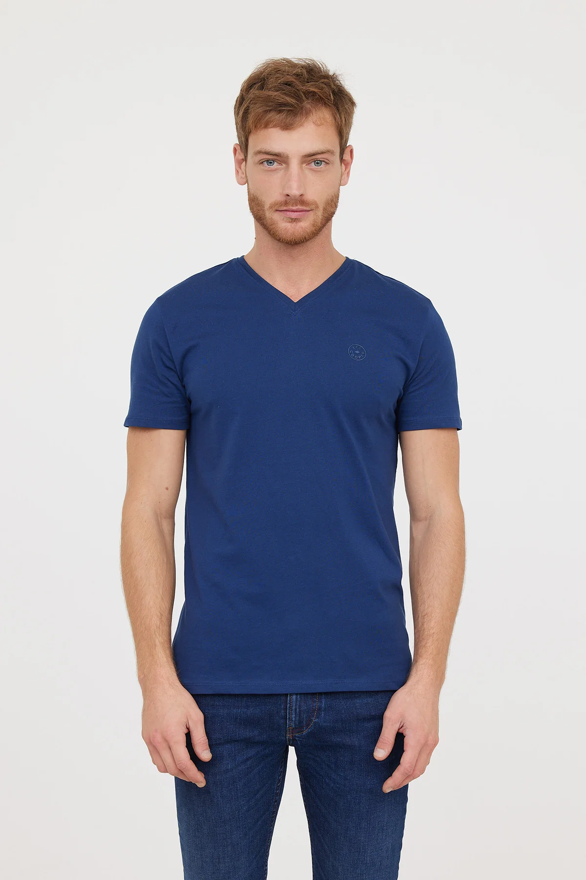 T-shirt basique col V manches courtes en coton bio avec print poirtine Le mannequin mesure 1.85 cm et porte la taille M