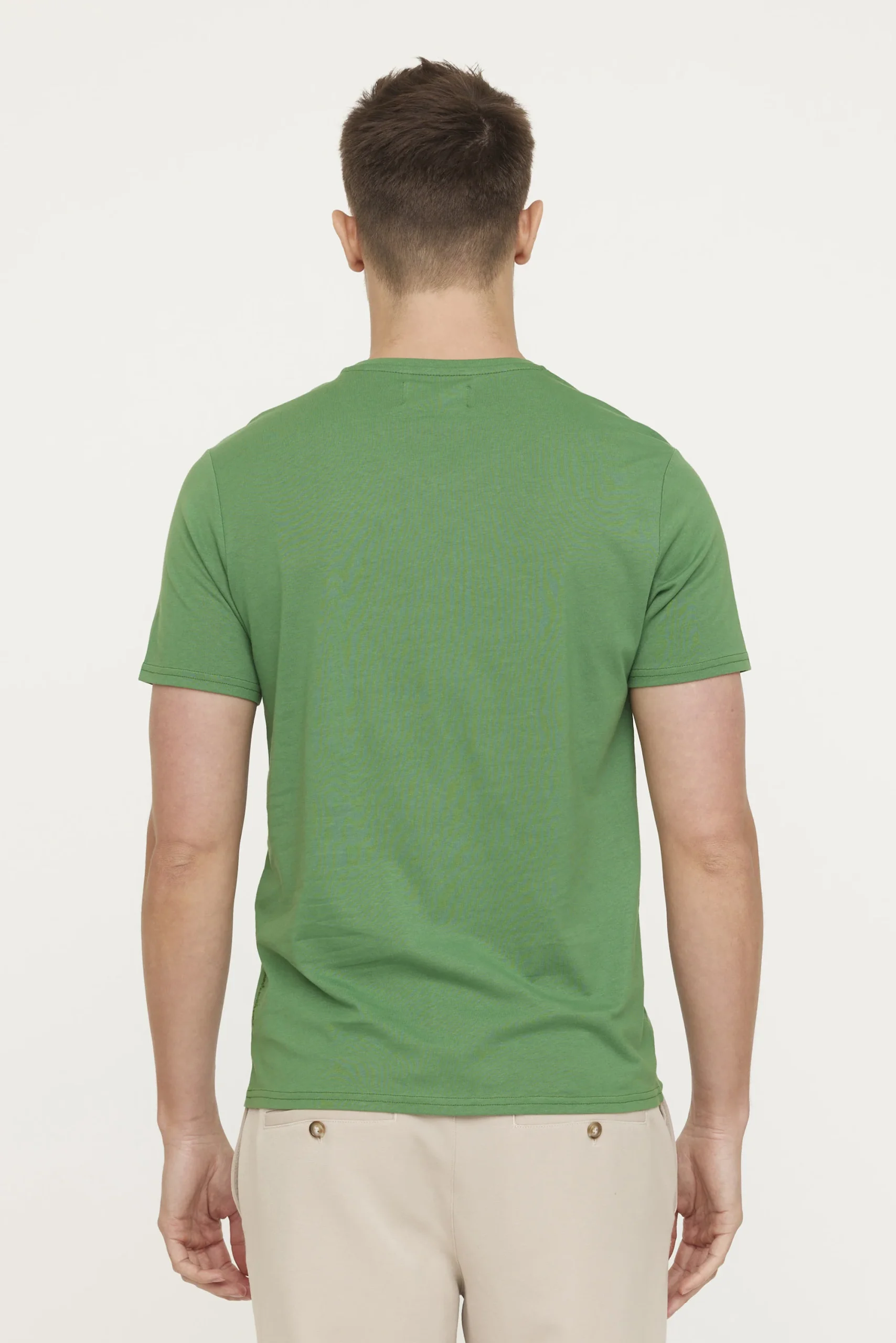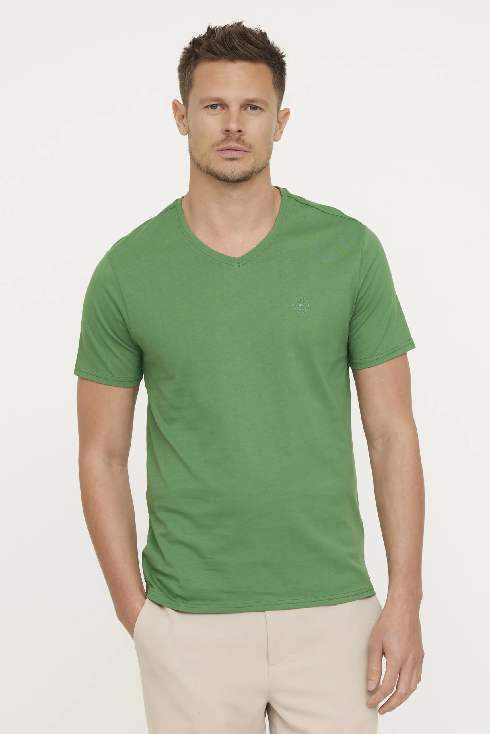T-shirt basique col V manches courtes en jersey de coton avec print poitrine, broderie « made with care » coté. Contient du coton organique Le mannequin mesure 1m85 et porte la taille M