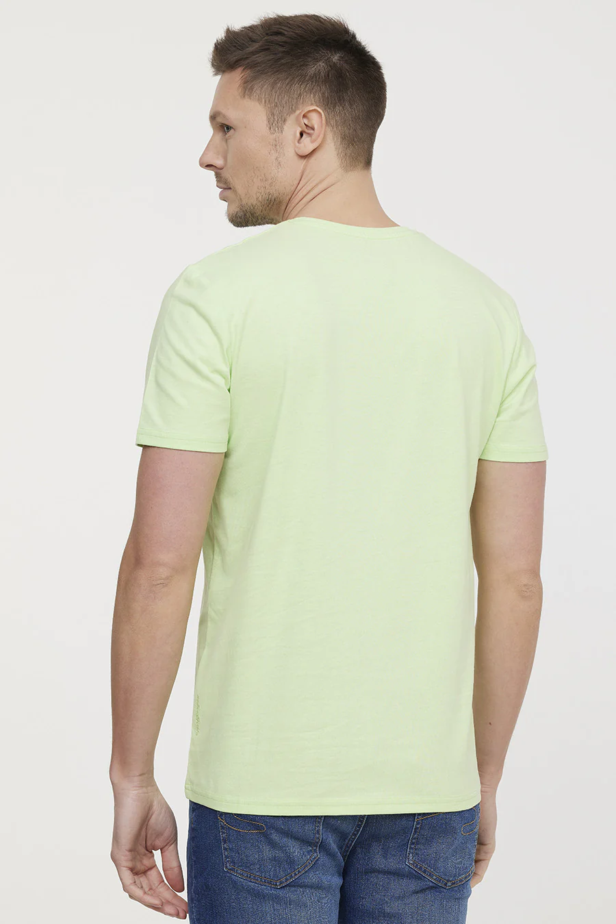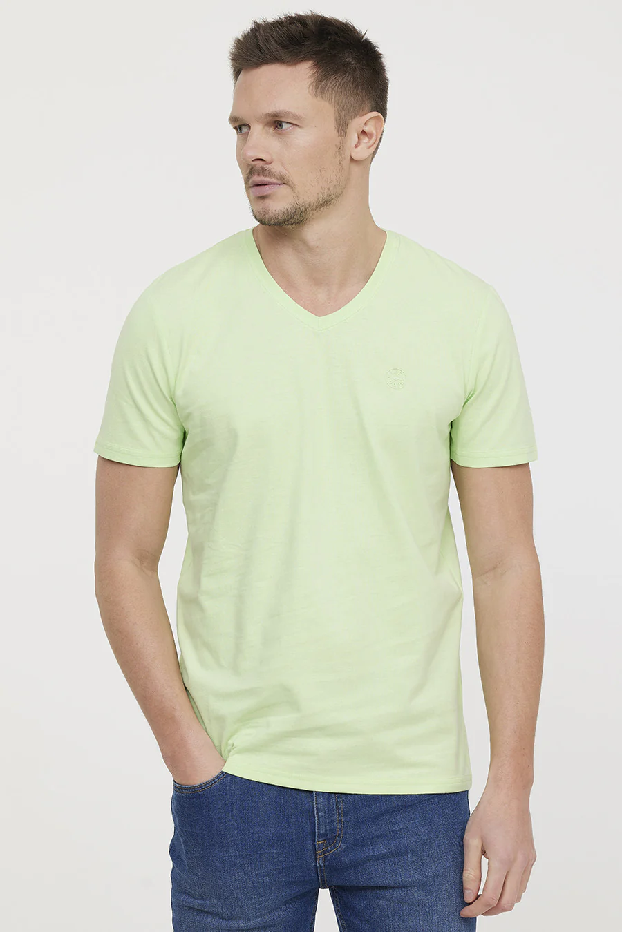 T-shirt basique col V manches courtes en jersey de coton avec print poitrine, broderie « made with care » coté. Contient du coton organique Le mannequin mesure 1m85 et porte la taille M