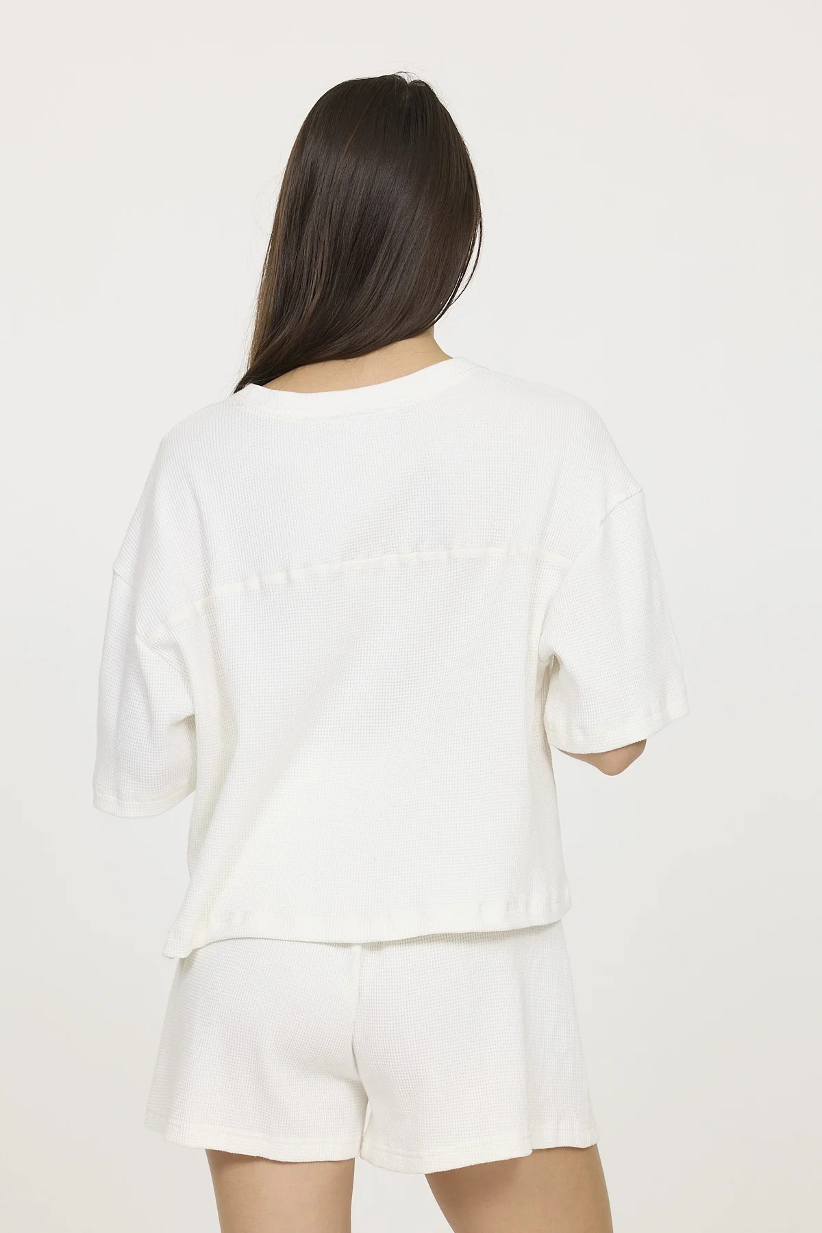 T-shirt Femme manches courtes et coupe boxy, conçu en Jersey gaufré 100% coton , il offre une sensation de douceur et de confort incomparable, idéal pour une utilisation quotidienne.