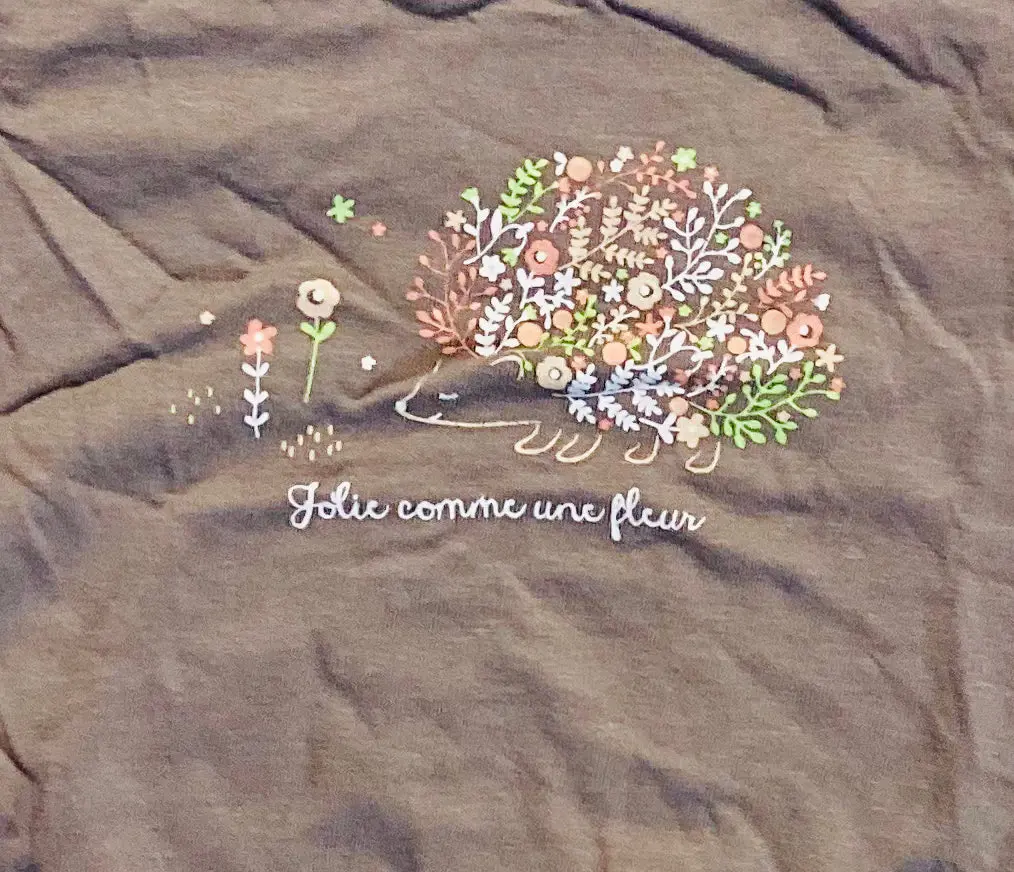 - Motif : Hérisson fleuri dans des tons de rose, blanc et vert clair avec écritures blanches.