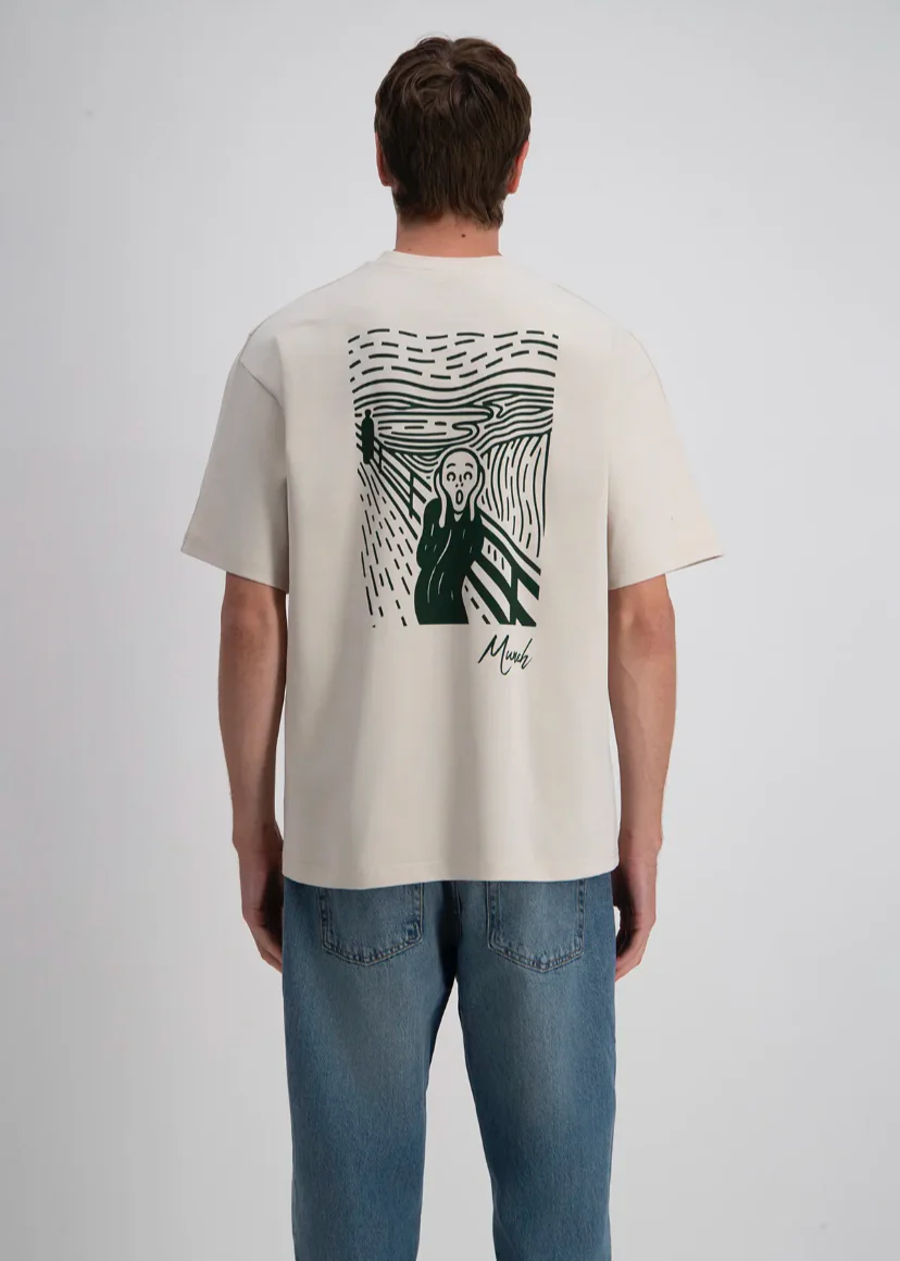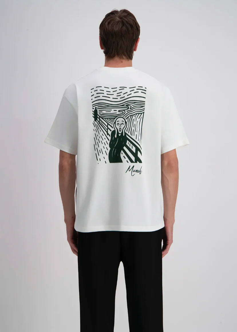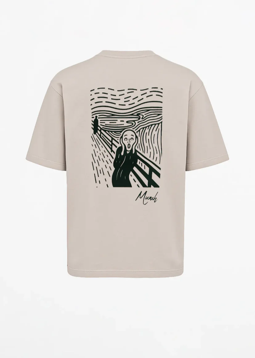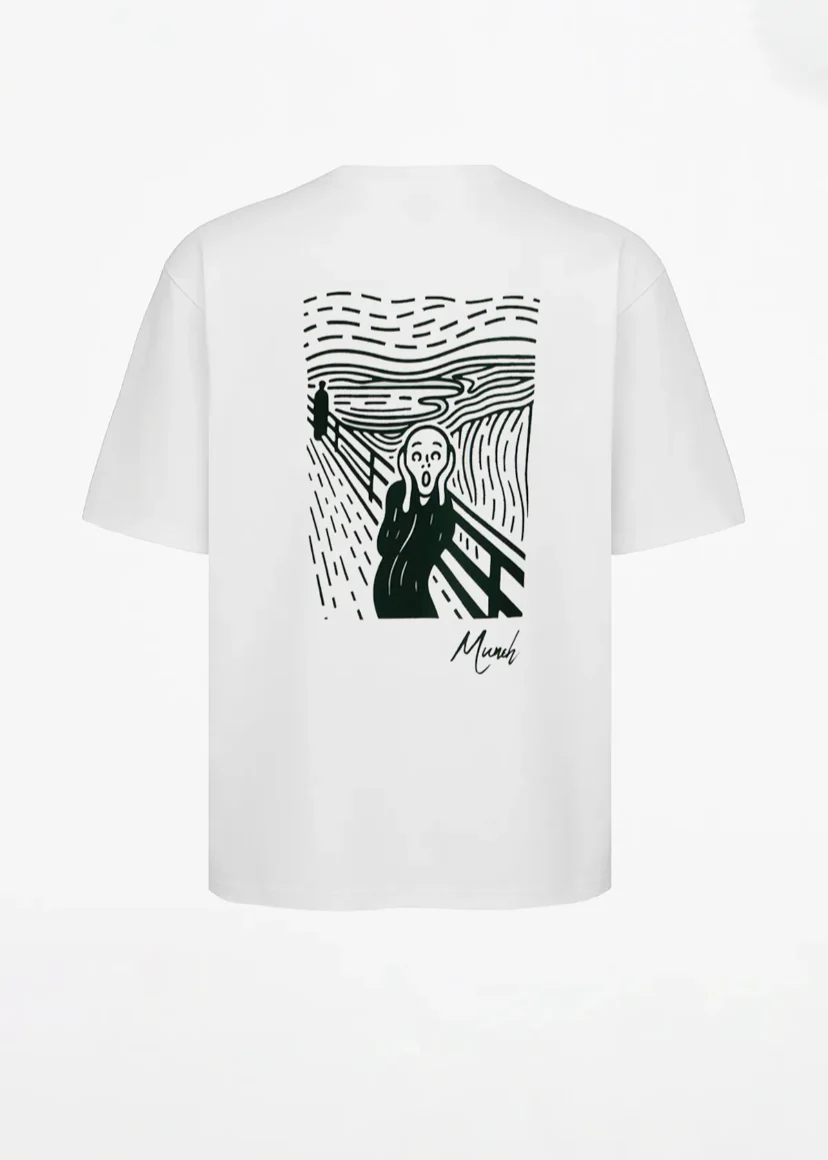Ce t-shirt oversize rend hommage à l’iconique tableau « Le Cri » d’Edvard Munch avec une réinterprétation graphique imprimée dans le dos. Une pièce au design fort qui mêle art et streetwear, parfaite pour affirmer un style audacieux et créatif au quotidien. Sa coupe ample assure un confort optimal et un look résolument moderne.