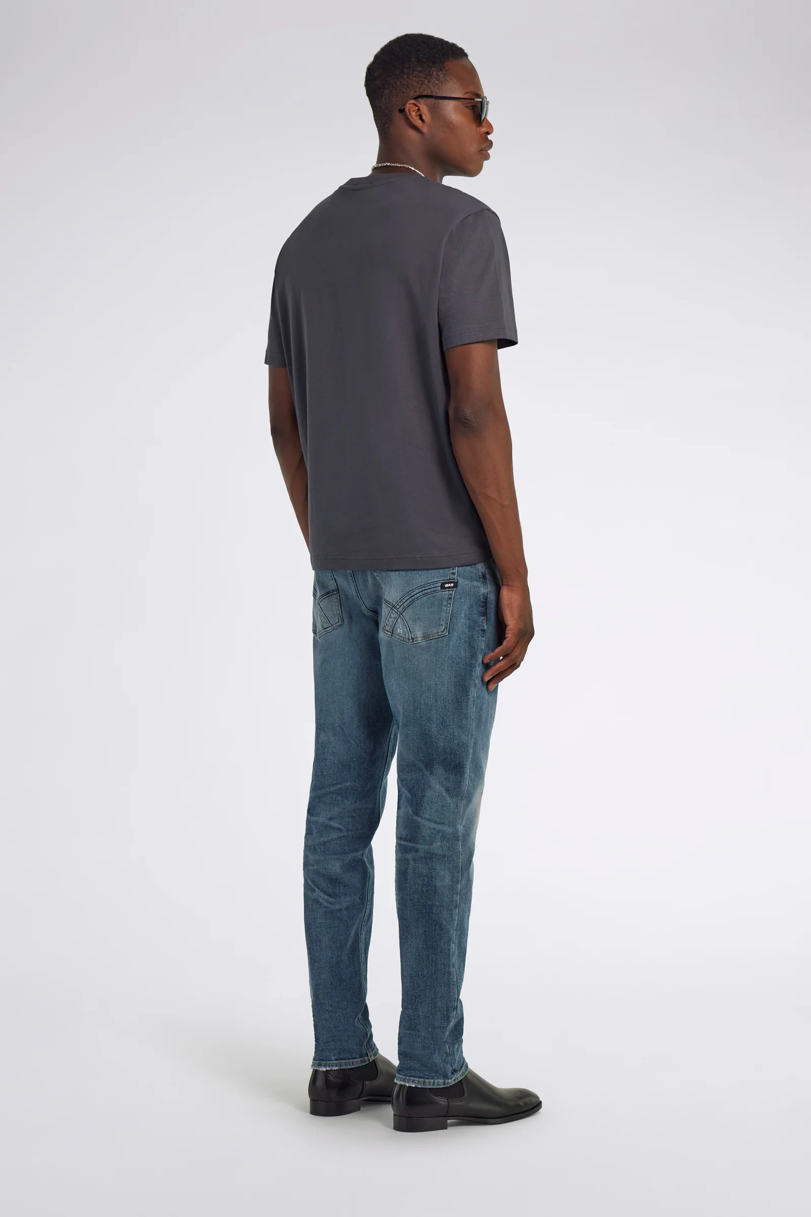 Denim 5 tasche tapered fit in tessuto rigido 12.50 OZ dall’aspetto autentico. Il lavaggio medium blue con piccole rotture dona profondità al blu indaco. I dettagli di costruzione sulle tasche anteriori e posteriori aggiungono un twist sofisticato a un capo pensato per distinguersi.