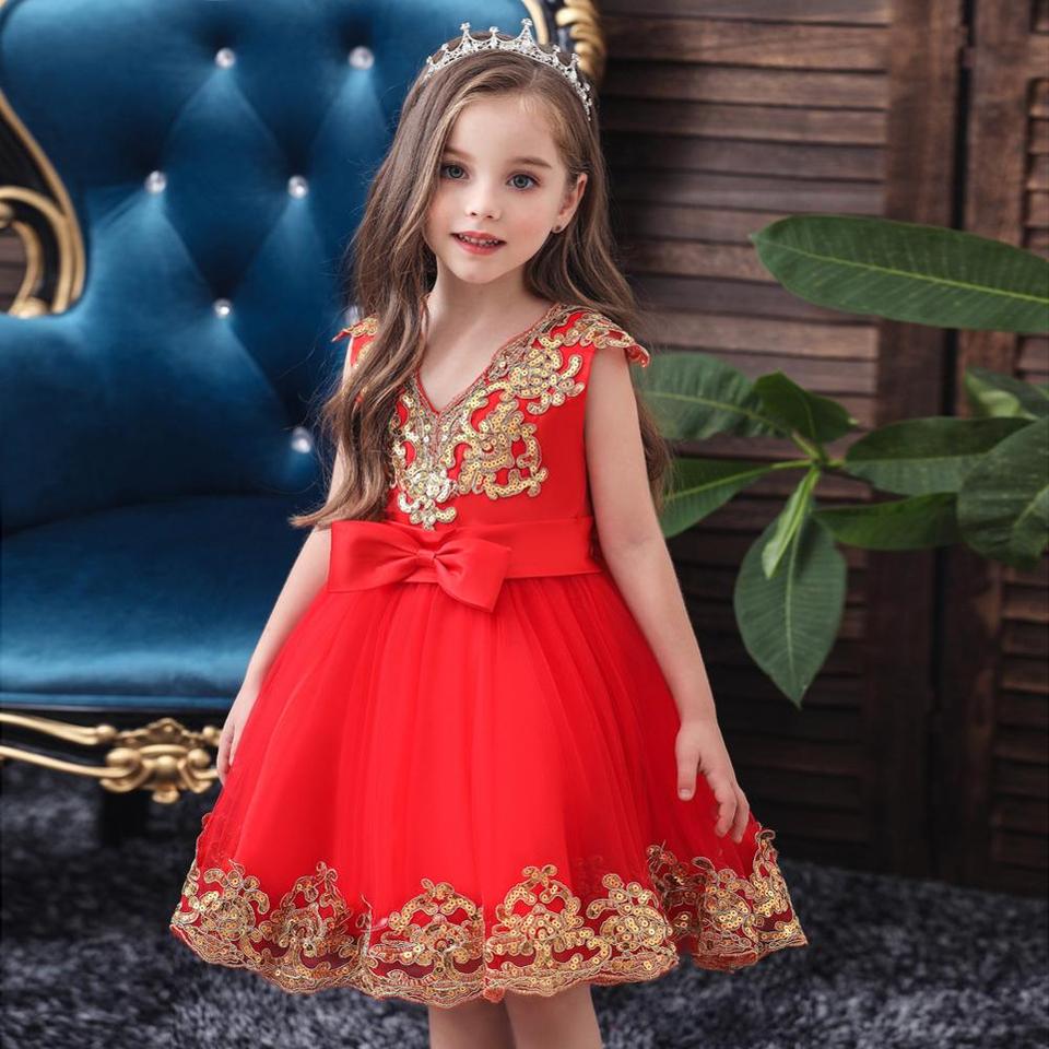 Offrez à votre enfant une tenue de princesse élégante et originale pour les fêtes avec cette robe rouge unie sans manches.
