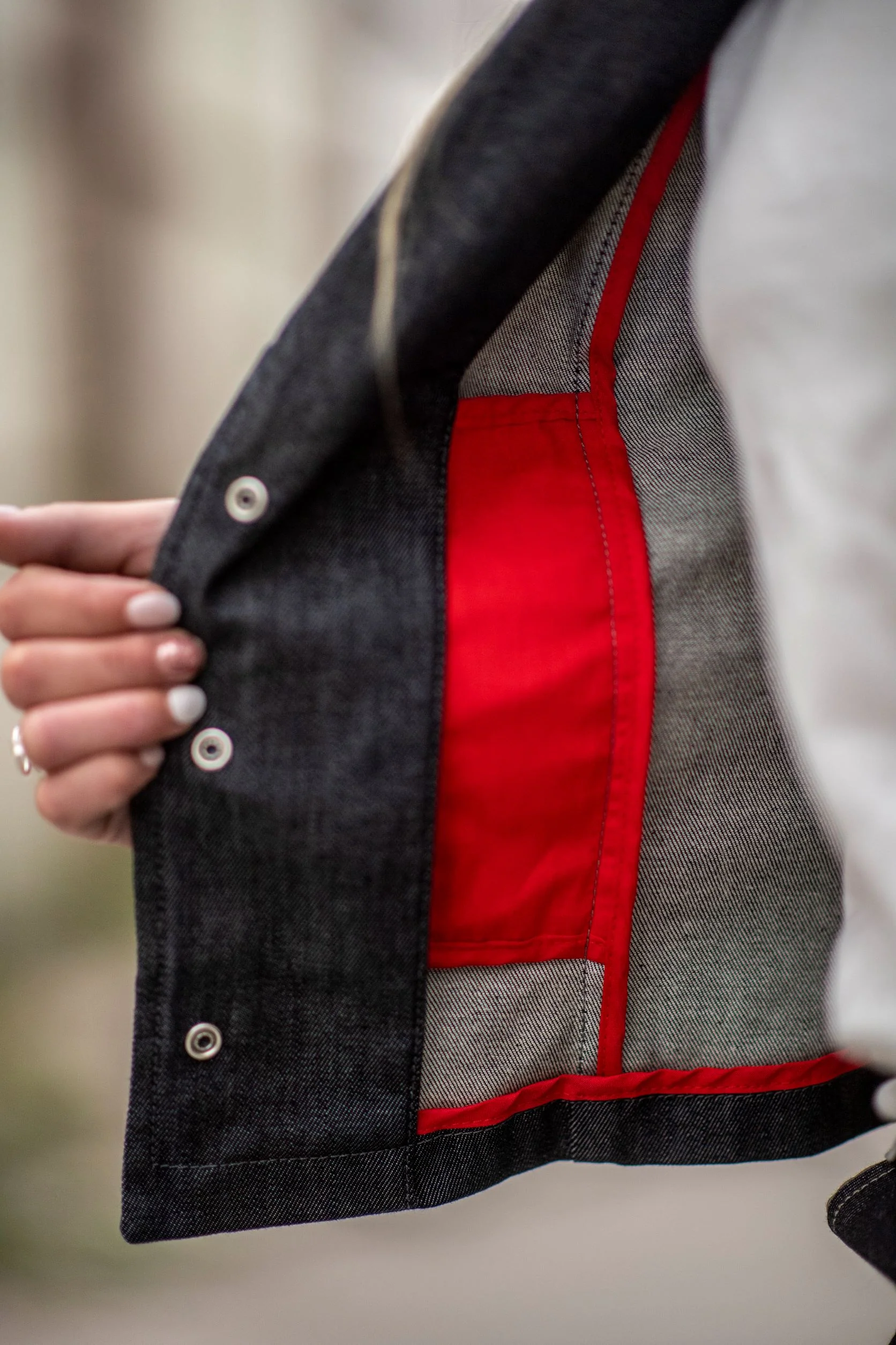 Veste en jean fabriqué en France par L’Usinier Français. Cette veste est composée d’un denim 98 % et 2 % élasthanne. L’intérieur de ses poches est doublé avec une toile 100% coton tissé dans les Vosges de couleur rouge.