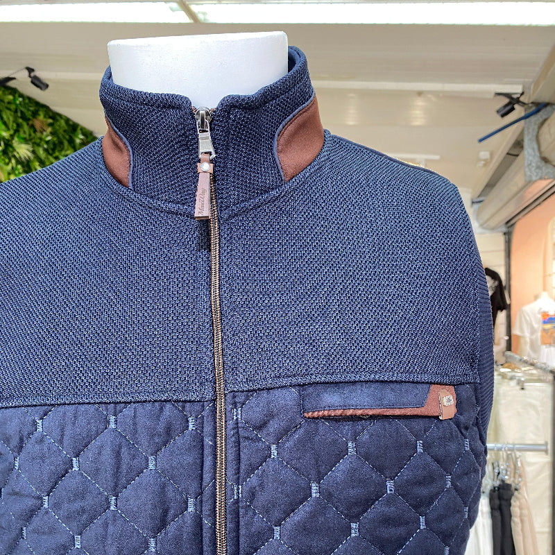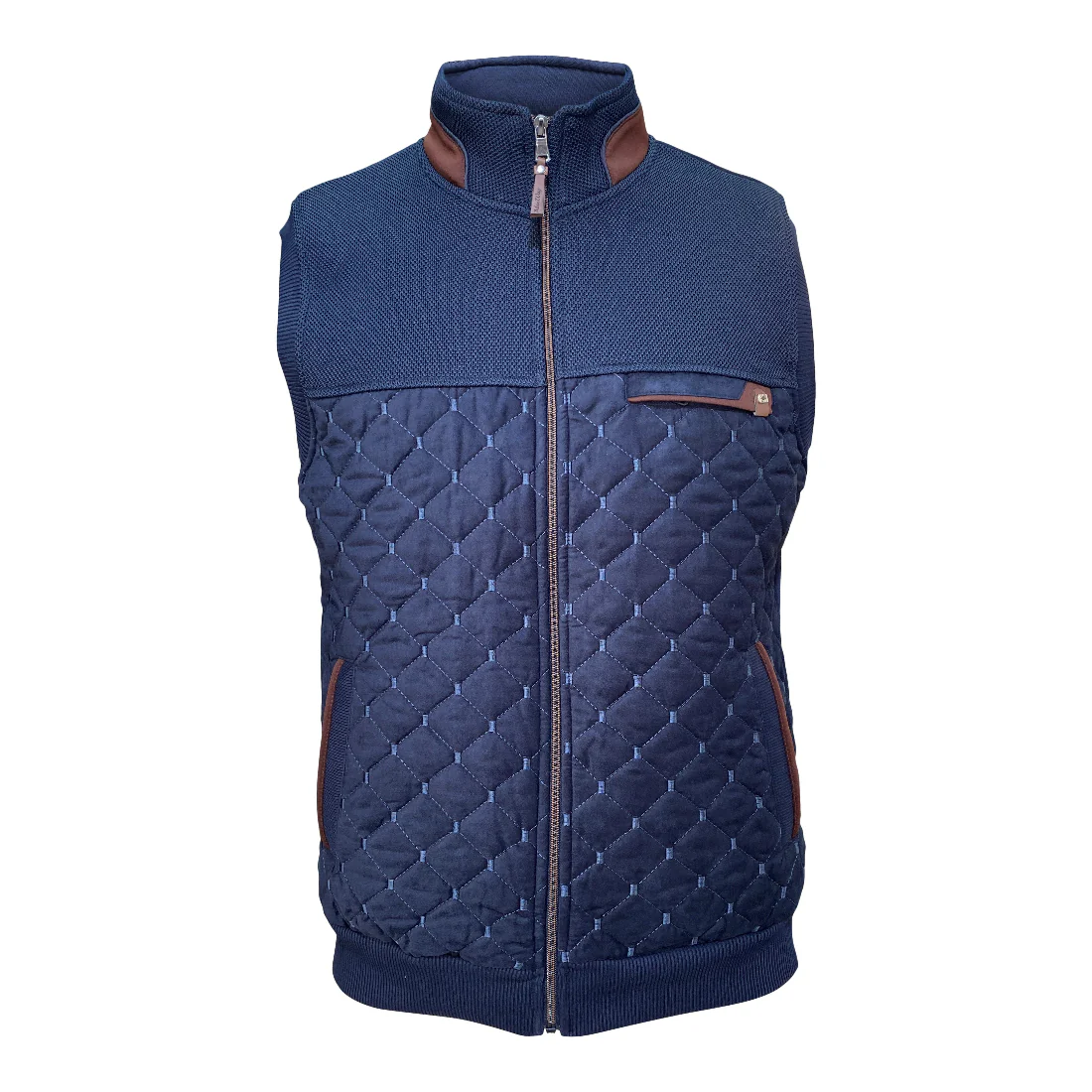 Type de vêtement : Gilet sans manches matelassé pour homme Couleur principale : Bleu marine Design avant : Partie inférieure matelassée avec motifs en losanges, partie supérieure en maille texturée Fermeture : Zip intégral sur le devant avec tirette en cuir Col : Col montant avec intérieur contrastant marron et insert décoratif au niveau du […]