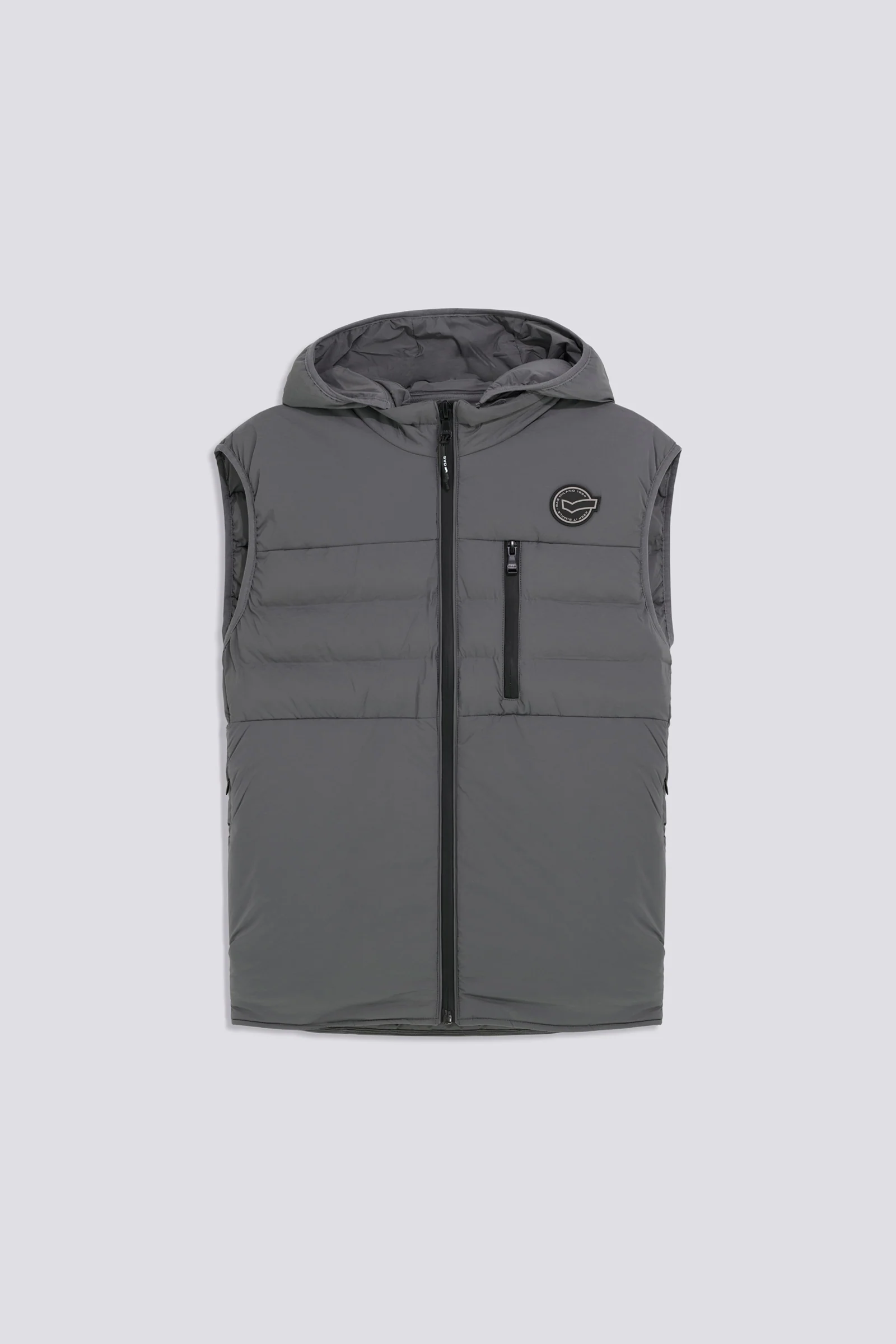 Minimal, funzionale, distintivo. Il bomber smanicato in nylon stretch termosaldato unisce un design essenziale a dettagli smart come il cappuccio staccabile, le zip laterali e il patch gommato sulla manica. Il fit slim valorizza la silhouette, mentre il tessuto tecnico garantisce comfort e protezione.