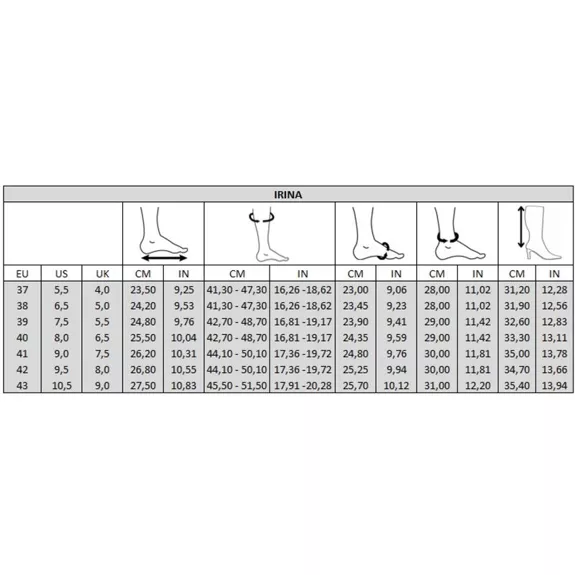 - Les santiags IRINA se distinguent par leur design classique et élégant. reflétant l’essence du style western avec une touche moderne. Que vous les portiez pour un événement spécial ou au quotidien. ces bottes sont conçues pour offrir à la fois style et confort s’adaptant parfaitement aux mollets de taille 2XL.