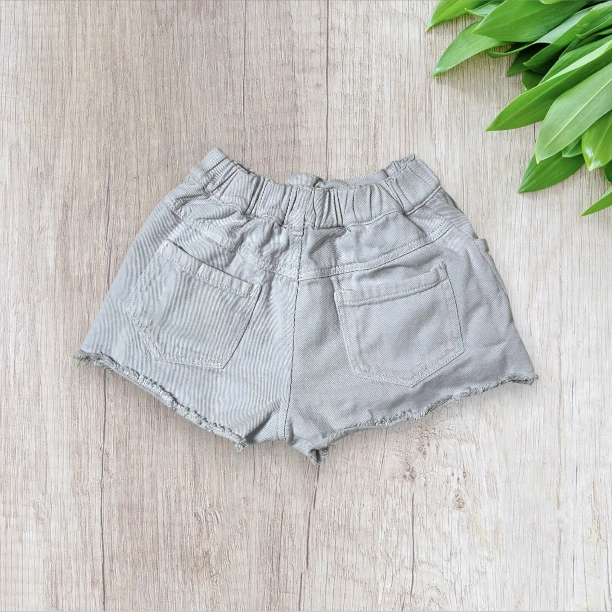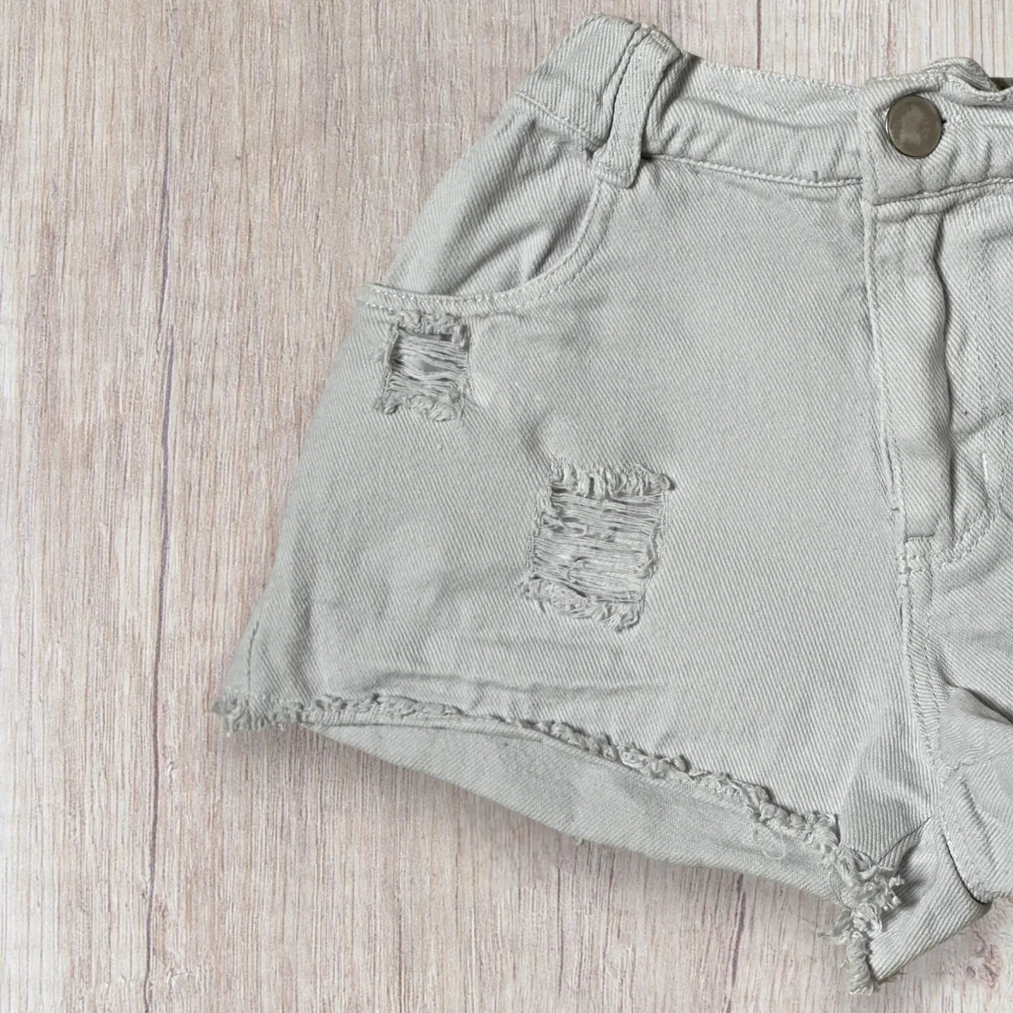 Ce short en jean blanc de la marque Shein, en taille 6 ans, offre une coupe tendance avec ses effets destroy sur les cuisses et ses bords effilés.